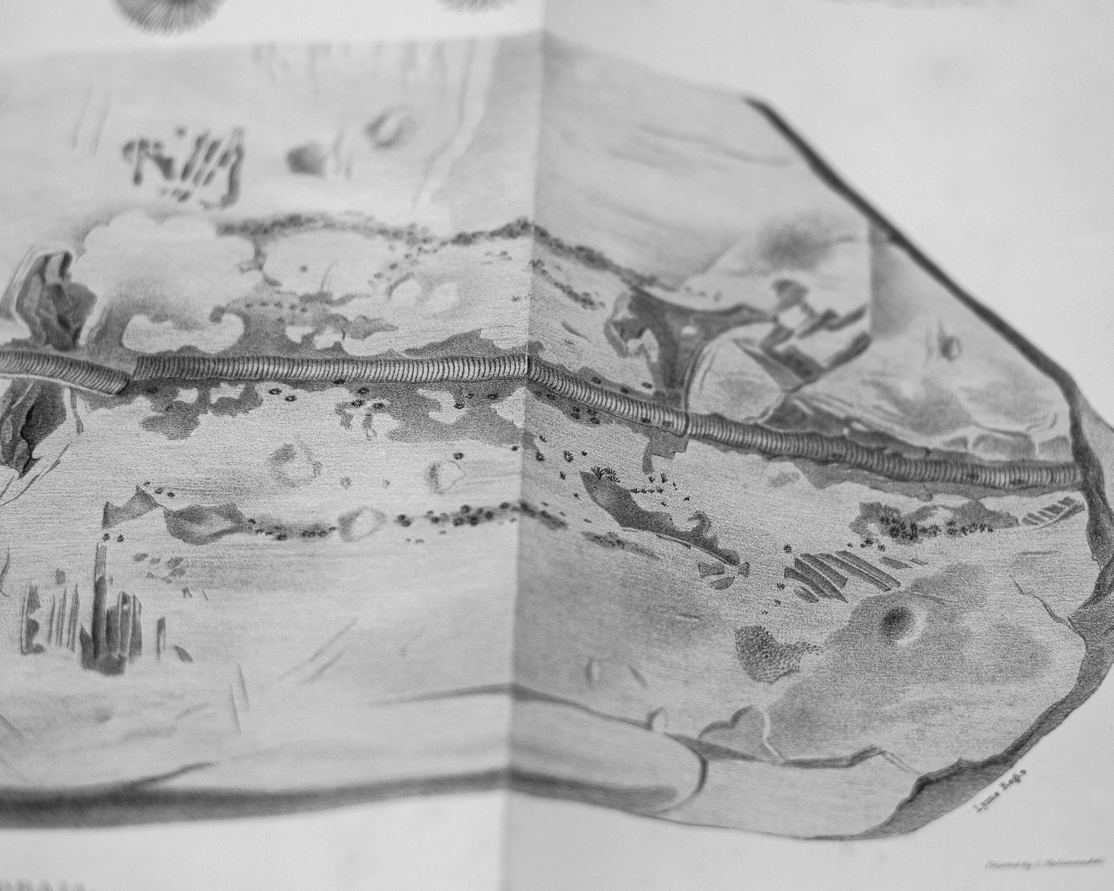 For the past seven years Jamie has been taking photographs of the fossils Anning found which are housed in museums across the UK. The resulting photographs reveal traces left behind as she worked to remove them from the rocks and cleaned and prepared them for sale. These marks allude to her labour in the harsh landscape of Lyme Regis and her endurance in the face of criticism and exploitation by the scientific establishment…