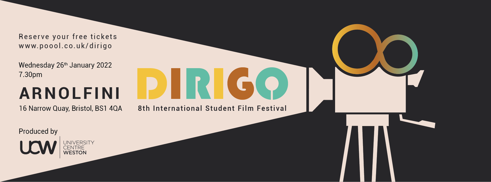 Dirigo is an International Student Film Festival directed and produced by Film and Media Arts Production, students from University Centre Weston. This festival aims to inspire and showcase the creativity of student filmmakers worldwide. It is an open festival with no set boundaries; we actively encourage new styles, voices and direction!